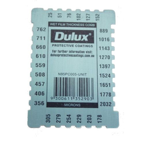 Protective Coatings are specifically formulated to meet specific performance requirements when they are applied with precise dry film thickness. Dulux Product Data sheets consistently provide information on the minimum, maximum, and recommended wet film thickness along with the corresponding dry film thickness for applying the coating. To gauge the wet film thickness while applying it, a tool known as a wet film comb (or wet film gauge) is frequently utilized. This tool is straightforward and efficient for assessing the thickness of wet paint films. A wet film comb is typically a rectangular piece made of metal or plastic featuring teeth of varying lengths, each representing a different film thickness. The longest teeth can be found at the top and bottom of both sides of the rectangle.